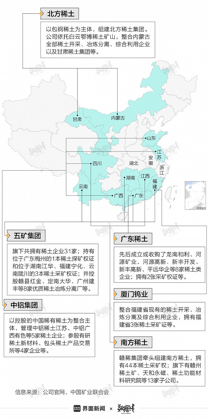 五矿集团和中铝集团均为中国稀土行业六大稀土集团之一。其余四大稀土集团为北方稀土(600111.SH)、厦门钨业(600549.SH)、中国南方稀土集团(下称南方稀土集团)和广东稀土集团。