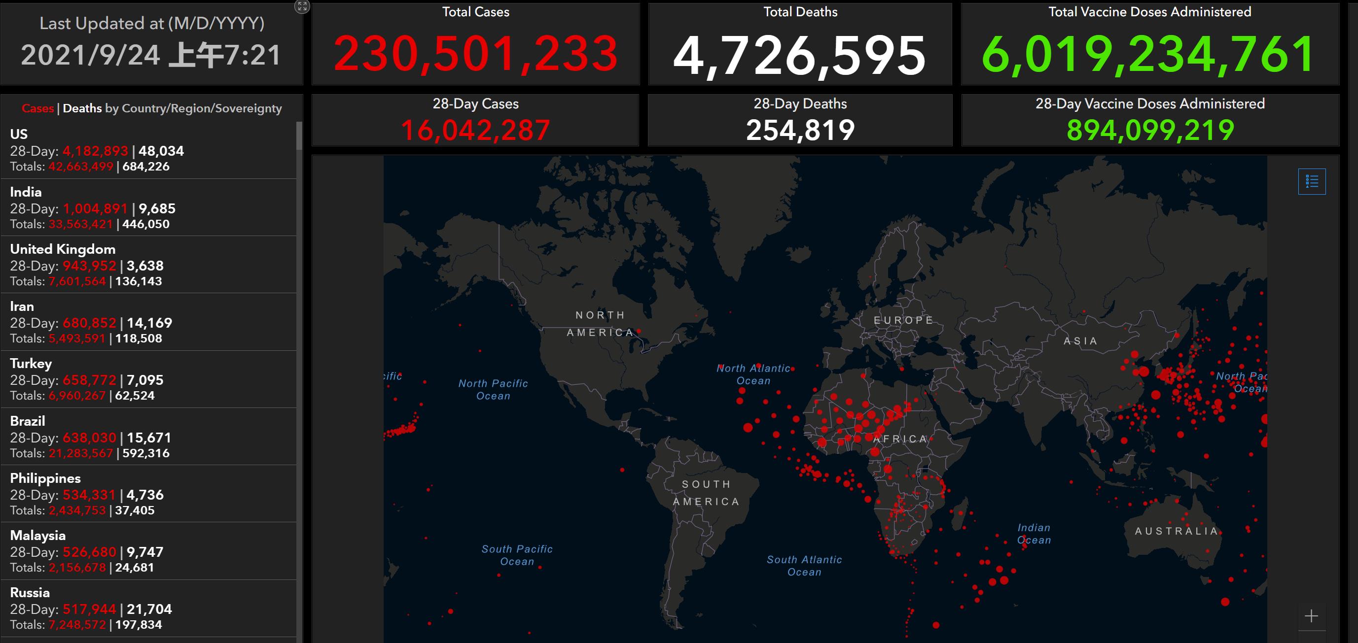 据约翰·霍普金斯大学的疫情追踪数据,截至北京时间9月24日上午8点,全球累计确诊新冠肺炎病例230501233例,累计死亡4726595例,接种疫苗超60.1亿剂次。