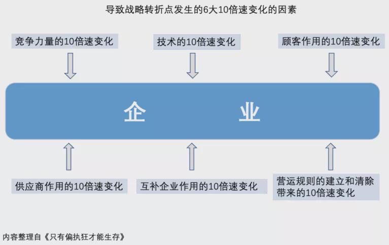 安迪·格鲁夫定义“战略转折点”是“一个企业生命过程中即将发生根本性变化的时刻”。这里的“根本性变化”,是指企业所在的产业环境里某一个重要因素发生了“10倍速变化(a ‘10X’ Change)”,在短期内势力增至原来的10倍,导致企业的竞争力发生了根本性变化。