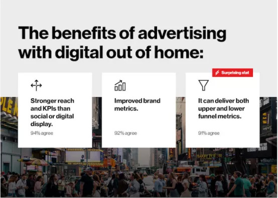 去年年底,Verizon Media做了一项调查,最新数据显示,在接下来的18个月(也就是2021年),参与户外媒体支出的美国广告决策者中有6/10(59%)希望增加其户外广告支出。绝大多数受访者认为DOOH的影响力和KPI高于社交媒体或数字展示广告(94%)。此外,人们普遍认为DOOH已提高了品牌指标(92%),并且可以提供较高和较低的渠道指标(91%)。