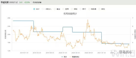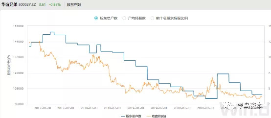 据WIND,华谊兄弟的股东总户数也是随着股价下滑而减少(下图中的黄线走势)。