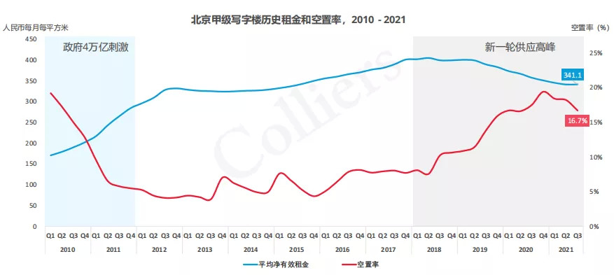 第三季度,北京甲级写字楼市场需求放缓,但依然保持较高水平,单季度净吸纳量21.5万平方米,剔除自用影响,净吸纳量为17.1万平方米,其中单一租户大宗租赁交易面积超过8万平方米。高力国际研究部董事陆明表示,2021年北京甲级写字楼市场需求预计达到80万方,远高于历史平均40万方的年度吸纳量,或创近十年新高。