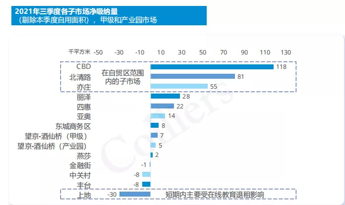 总体来看,本季度北京商办市场净吸纳量表现最好的3大区域分别为:CBD、北清路、亦庄,三大区域累计净吸纳量超25万平方米,且均被划入自贸区范围之内未来自贸区范围内的子市场以及上地、望京-酒仙桥和中关村,将是需要重点关注的区域。