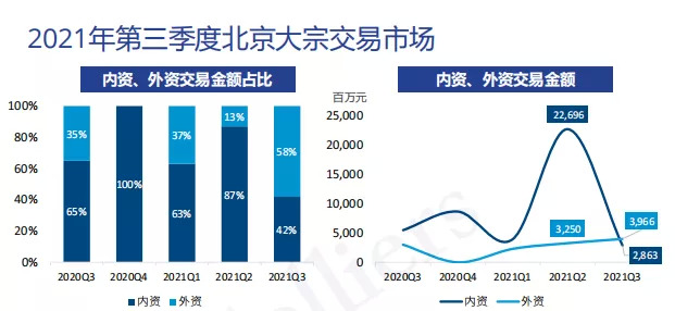 本季度,外资投资者持续加码北京市场,本季度共完成近40亿元交易,环比增加22%,约占本季度成交总额的58%,;内资买家共计完成28.63亿元交易,约占本季度成交总额的42%。