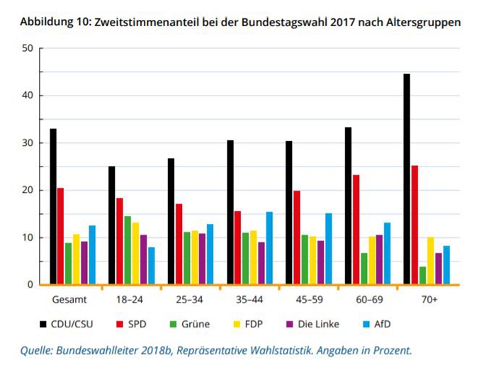 报告显示,2017年选举的第二票投票时,虽然在每个选民年龄组中,对联盟党和社会民主党这两个传统大党的支持率均为最高,但年龄越大选民组对联盟党的支持率就越高。70岁以上选民中有约45%支持联盟党。