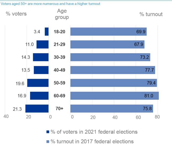 2013年德国联邦议会选举时,50岁以上选民首次占到一半以上。4年后,60岁以上选民占比为36.1%,30岁以下选民占15.4%。