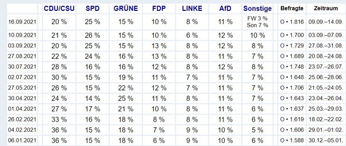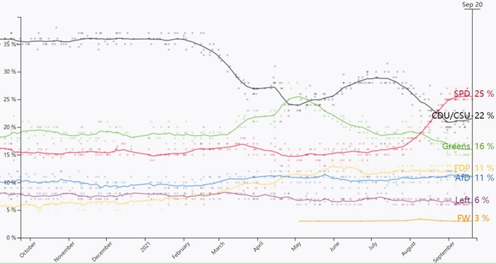 而今年选举的不确定性也大于往年。从4月开始,执政党联盟党(基民盟/基社盟)、中左派的社会民主党以及绿党不断在民调中起伏,都成为过支持率最高的政党。