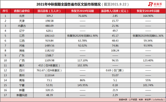 与2019年中秋假期全国各省份旅游收入的情况相比,北京、广西、宁夏等省份已超过疫前水平,其中北京旅游总收入同比增长达到64.9%,成为17个省级行政单位中旅游收入增长最快的省份。游客接待量超过疫前同期的有宁夏、广西和重庆三个省级行政单位,其中宁夏是游客接待量增长最快的省份,已恢复至2019年同期的145.95%。