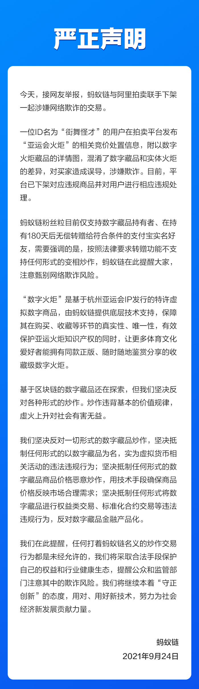9月24日,蚂蚁链官方表示,接网友举报,蚂蚁链与阿里拍卖联手下架一起涉嫌网络欺诈的交易——一位ID名为“街舞怪才”的用户在拍卖平台发布“亚运会火炬”的相关竞价处置信息,附以数字火炬藏品的详情图,混淆了数字藏品和实体火炬的差异,对买家造成误导,涉嫌欺诈。