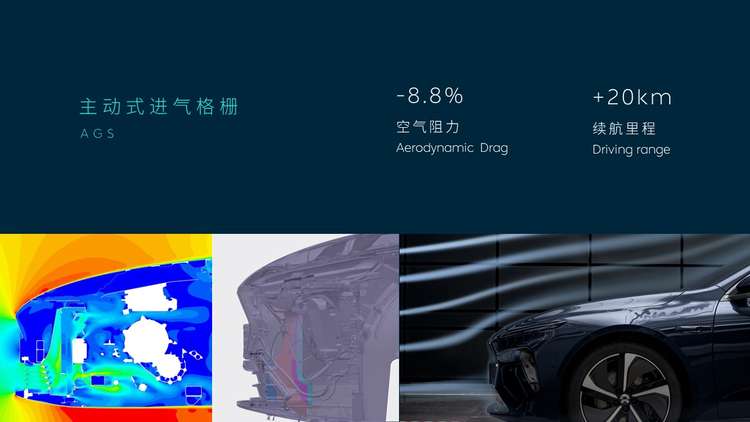 相比瞭望塔,AGS主动式进⽓格栅对风阻系数的贡献就显得异常明显,它在换热需求较低的情况下关闭叶⽚,最⾼可降低⽓动阻⼒9%,续航⾥程提升20公里。配合优化过的X-Bar家族前脸提升续航12.8公里,但车前部分就对整体续航作出了超过30公里的优化贡献。