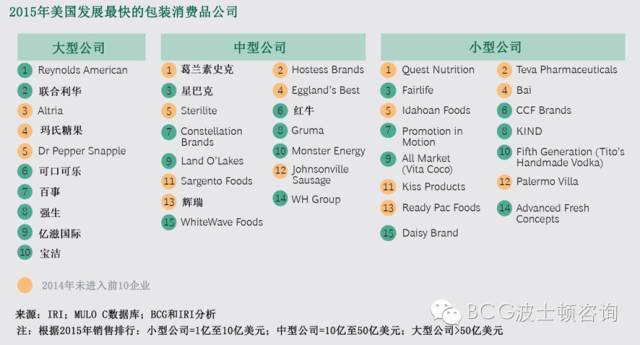 在大型公司中,发展最快的是Reynolds American烟草公司(收购了Lorillard烟草公司)、联合利华、Altria、玛氏糖果、以及Dr Pepper Snapple集团。中型企业的领先者有葛兰素史克、Hostess Brands、星巴克、Eggland’s Best和Sterilite。小型企业中,Quest Nutrition、Teva制药、Fairlife、Bai和Idahoan食品成长速度最快。