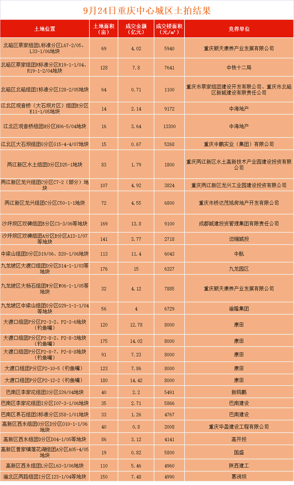9月24日,重庆第二次集中供地土拍在开拍当天即落下帷幕。