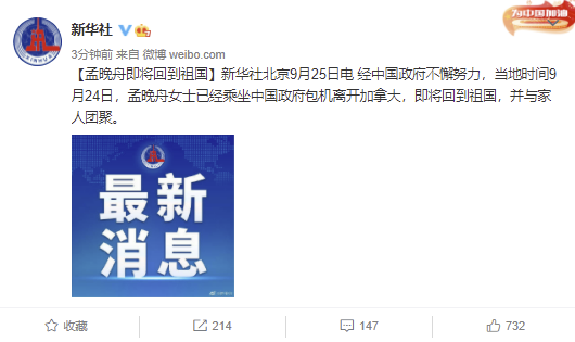 据@新华社 微博9月25日消息,经中国政府不懈努力,当地时间9月24日,孟晚舟女士已经乘坐中国政府包机离开加拿大,即将回到祖国,并与家人团聚。