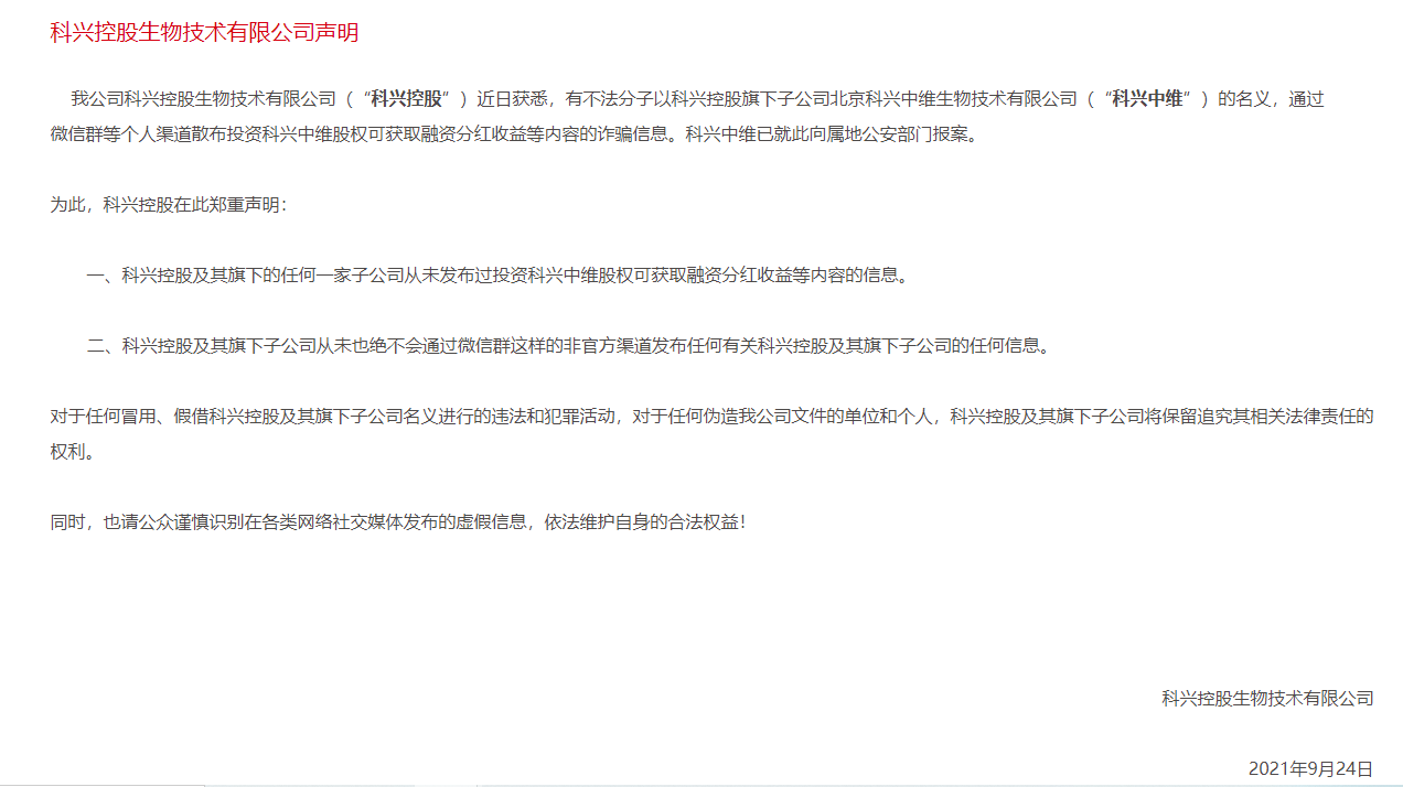 一、科兴控股及其旗下的任何一家子公司从未发布过投资科兴中维股权可获取融资分红收益等内容的信息。