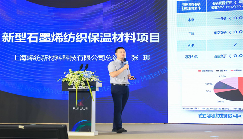 上海烯纺新材料科技有限公司总经理张琪在会上推介了“新型石墨烯纺织保温材料”项目;