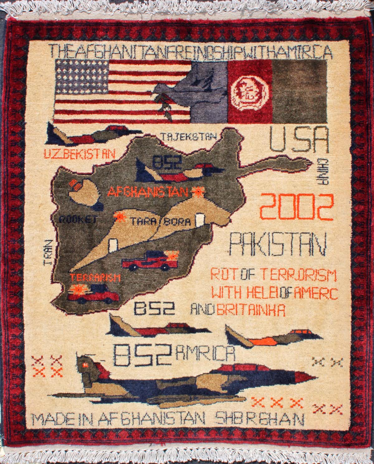 最早的此类地毯似乎是在1979年苏联入侵阿富汗后不久,在巴基斯坦的难民营中出现的,那里有数百万迁居至此的阿富汗人。这些地毯以枪支、直升机和坦克图案为特色,体积小,用粗糙的羊毛制作,非常简陋。地毯销售商和纪念品商店将它们推销给非政府组织的工作人员和西方政府官员。