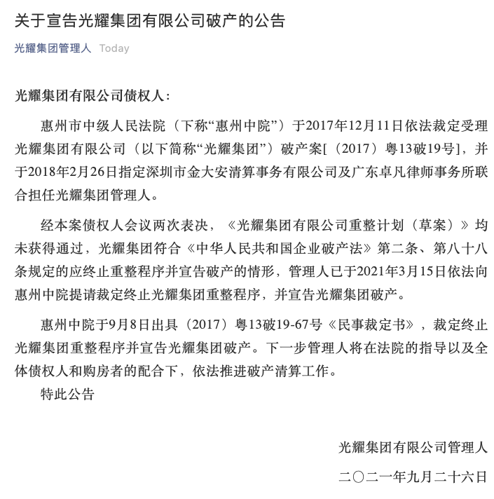 9月26日,光耀集团有限公司管理人通过微信公众号发布公告称,惠州中院于9月8日出具(2017)粤13破19-67号《民事裁定书》,裁定终止光耀集团重整程序并宣告光耀集团破产。下一步管理人将在法院的指导以及全体债权人和购房者的配合下,依法推进破产清算工作。