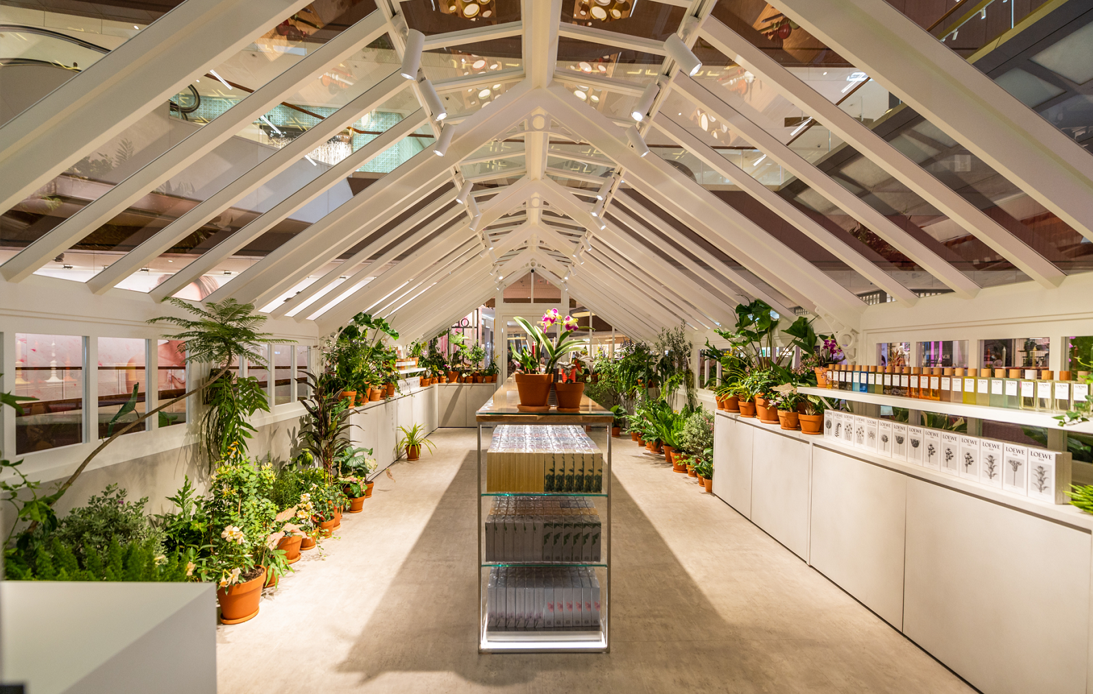 LOEWE的创意总监乔纳森·安德森 (Jonathan Anderson) 在自己的个人温室中找到了家居香氛系列的灵感,温室位于他在伦敦的花园中,种植着精心挑选的植物、蔬果和五颜六色的兰花。 位于广州太古汇的LOEWE香氛快闪店则复刻这一灵感,用尖顶型维多利亚式温室重现了英式传统,打造了一个身临其境的浪漫舞台。