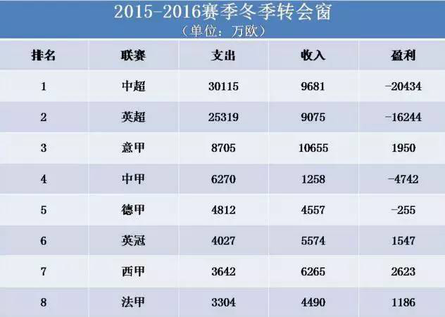 根据德国足球数据网站“转会市场”公布的数据,截止到2月17日,中超在冬季转会窗口的投入已超过3亿欧元,超过排名第二的英超近5000万欧元,位居整个榜单的第一位。此外,中甲联赛也以6270万欧元的投入额超过了德甲、西甲和法甲位居第四,可见如今的国内转会市场有多么疯狂!