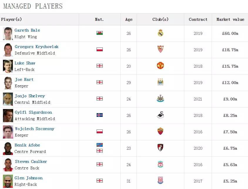 另据“转会市场”的统计,目前Stellar Group旗下的球员有10名市场价值超过500万美元,当家球星Gareth Bale的身价更是高达6000万美元。