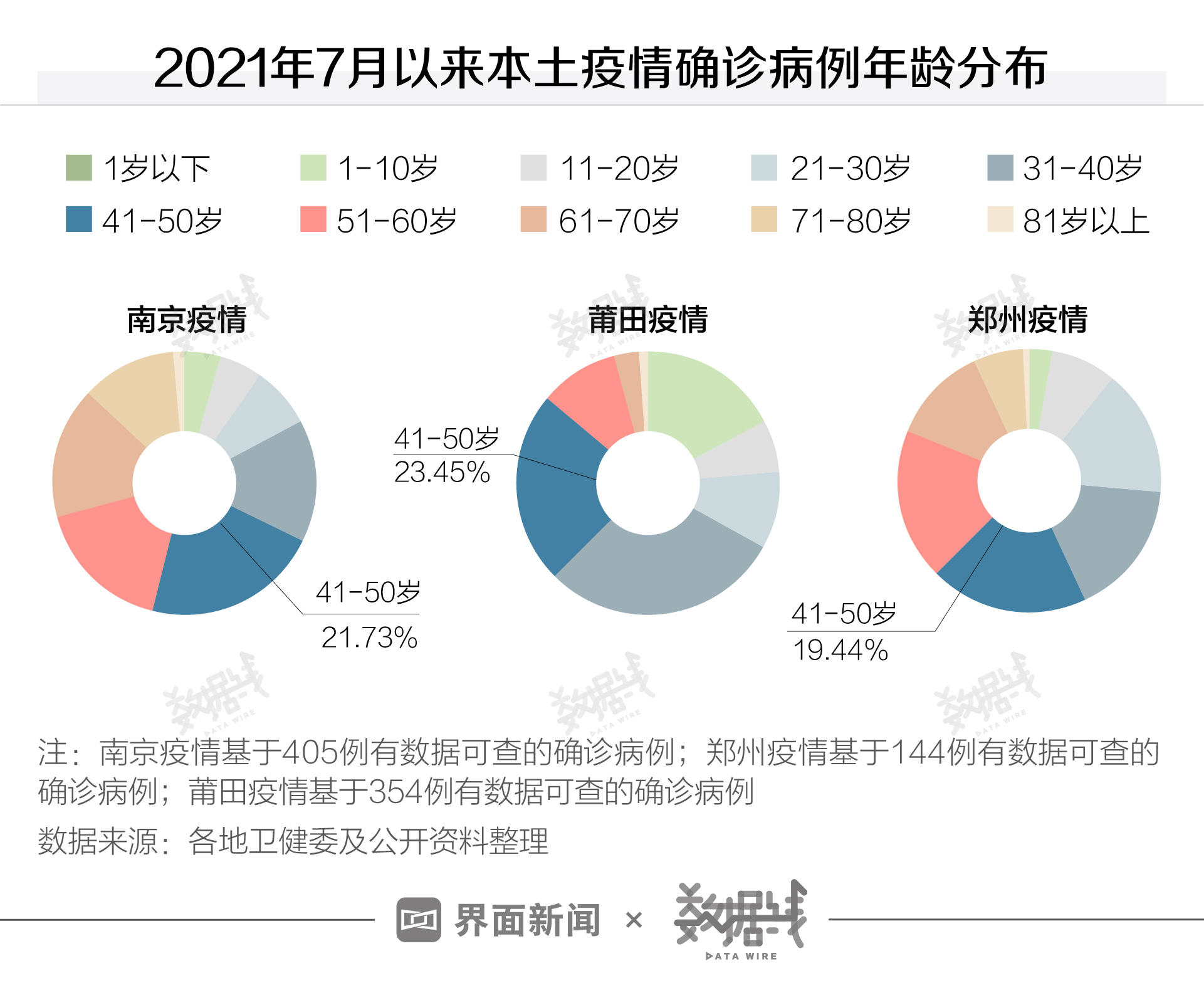 分年龄层次来看,哈尔滨疫情尚未有病例年龄信息公布。从纳入统计的合计超900例南京、莆田、郑州疫情确诊(含阳性)病例来看,“41-50岁”患者居多。“41-50岁”患者在南京、莆田、郑州疫情病例中的占比分别达到21.73%、23.45%和19.44%。