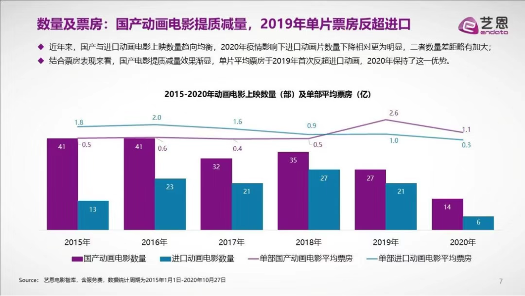 到2019年,《哪吒之魔童降世》在暑期档一骑绝尘,让观众和从业者看到了国产动画电影也有形成IP的可能性,艺恩数据的《中国动画电影市场研究报告》显示,2019年单部动画电影平均票房第一次反超了进口动画,且2018-2020年的动画电影票房冠军均为国产。