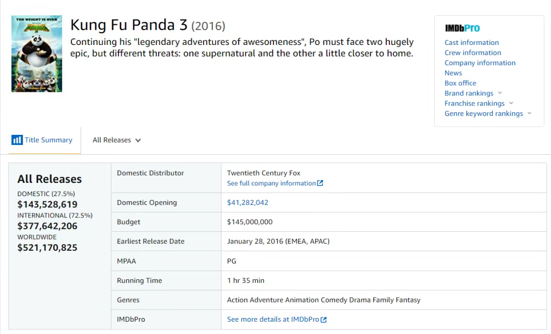 事实上,系列在中国的收入占比每部都在提升,《功夫熊猫》的中国票房仅占全球票房约4%,《功夫熊猫2》占14%,到《功夫熊猫3》,达到近30%。