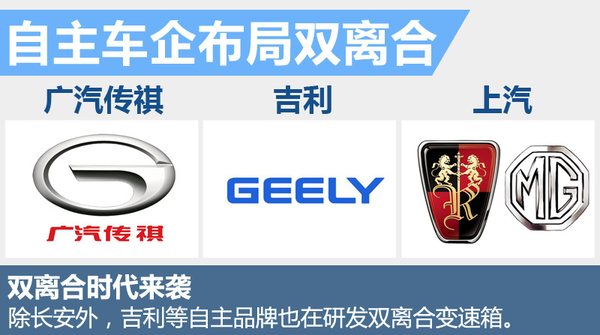 虽然双离合变速箱技术存在诸多争议,但并不妨碍车企对它的推崇。大众、通用早已将7速双离合变速箱普及在旗下多款产品中。自主品牌方面广汽传祺GA6等多款车型已搭载7速双离合变速箱。吉利汽车、上汽也在研发7速双离合变速箱。在推出5速双离合变速箱后,长安量产的第二款双离合产品就是7速双离合变速箱,最快将于年内投产。