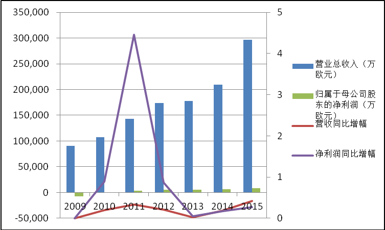 Wind数据显示,库卡集团2009年以来,营业收入和净利润呈现出连续增长的态势,营业收入自2009年的9.02亿欧元增长至2015年的29.66亿欧元,归属于母公司股东的净利润也由2009年亏损7574万欧元扭亏增长至2015年的8680万欧元,不过各年份之间业绩波动程度较大。