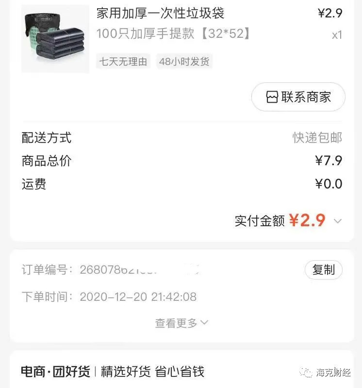 海克财经在2020年12月曾体验过美团的团好货功能,购买了其首屏推荐的2.9元包邮的100只垃圾袋。目前来看,这一商品早已下架,经营的店铺也已清空商品。在美团电商主页搜索垃圾袋,最便宜的也需花费10.6元购买,原先几元包邮的小商品了无踪迹。平台主要宣传语也变为了“精选好货、严选供应商”。