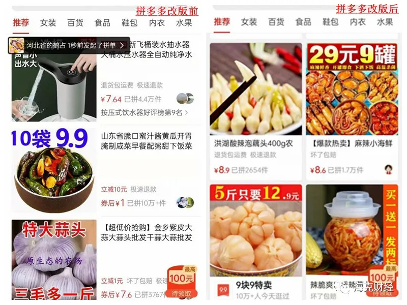 巧合的是,在近期产品改版中,拼多多也将延续多年的单列商品信息流改成了双列模式,这和美团电商产品外观已十分相近。