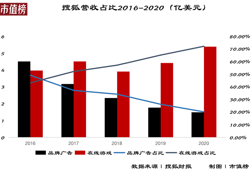 当前,剔除搜狗后,搜狐营收主要分为三个部分:品牌广告、在线游戏、其他。其中品牌广告与在线游戏,合计贡献超过九成营收。自2016年以后,游戏业务营收占比逐年走高。