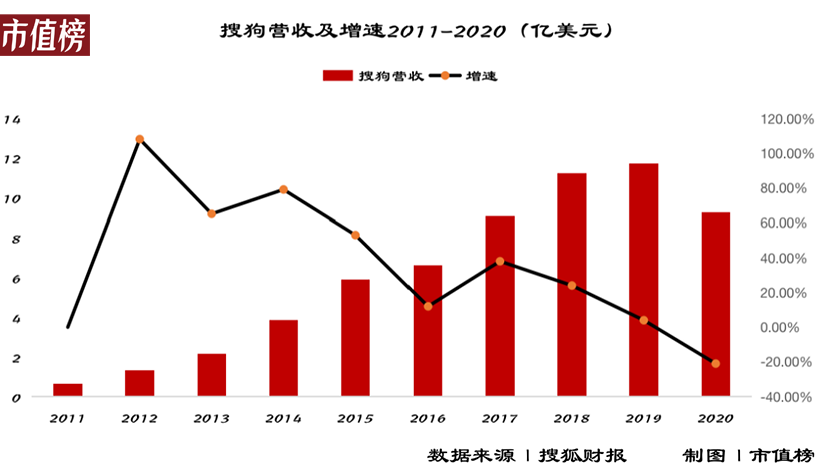 但这并不意味着搜狗进入一个快速发展的阶段,搜狐整体的营收在2015年以后出现负增长,再往后也近乎停滞,也就是说,搜狗营收占比的增加,实际上是在搜狐不断没落的情况下体现出来的。