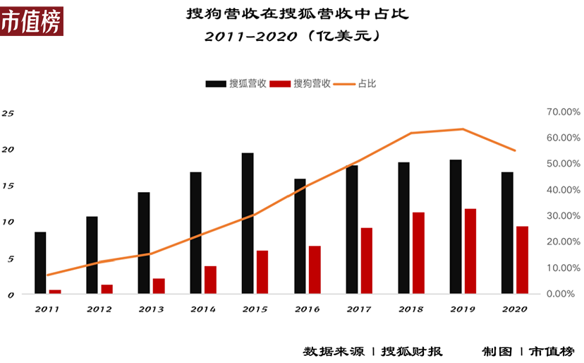 2017年上市以后,搜狗在搜狐集团营收中的占比一度超过50%,几乎成为搜狐唯一的优质资产。