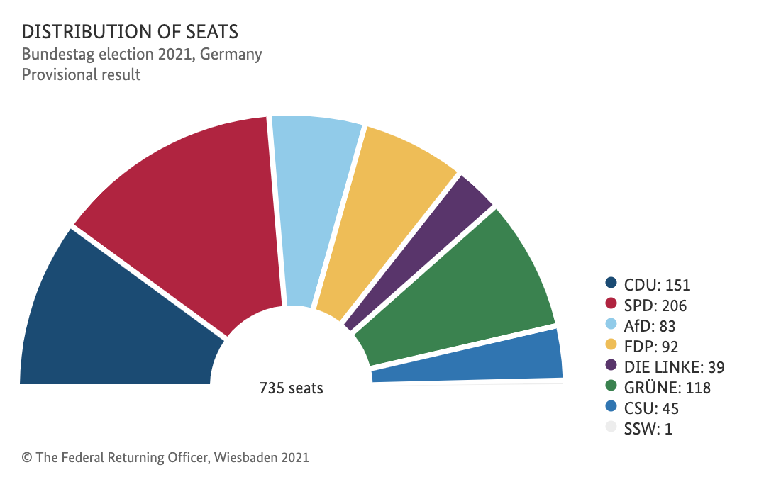 据俄罗斯卫星通讯社9月27日报道,德国联邦选举委员会公布,新一届联邦议院包括735名议员,其中社民党206人,基民盟/基社盟196人,绿党118人,自民党92人,德国选择党83人,左翼党39人。