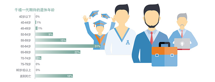 在中国,43%的年轻人超过65岁才考虑退休,而打算工作到70岁的占21%,更有18%的受访者希望毕生工作。这个结果让人意外,在社会上大多数人反对国家延退政策的时候,千禧一代却准备进行一场职场马拉松。