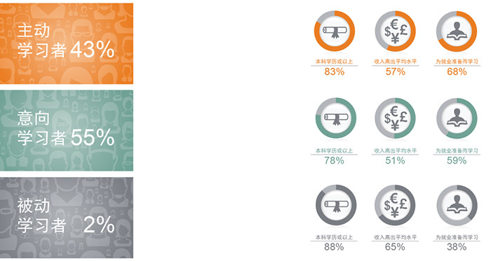 对比懒惰的标签,数据却呈现了不一样的事实:相比数前代,千禧一代工作更努力。调查结果显示中国84%受访者每周工作超过40小时,30%甚至每周工作逾50小时,并且25%的受访者同时就职两份或以上工作。同时,调查发现80%的中国千禧一代清醒地意识到持续提升技能是未来职业发展的关键,仅2%对培训毫无兴趣,43%的年轻人都能够主动学习。有74%的千禧一代笃志终生学习,愿意为培训投资工作外时间和个人收入。