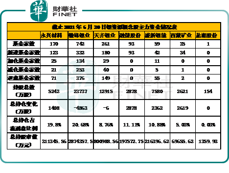 截止2021年6月30日,持仓永兴材料的基金公司总共有170家,排名第三,持股综数5000多万股,总持仓占流通盘比例为19.8%,从基金总数与持股总数来看,永兴材料在主力资金青睐度方面,仅次于赣锋锂业与天齐锂业,具体如下表所示: