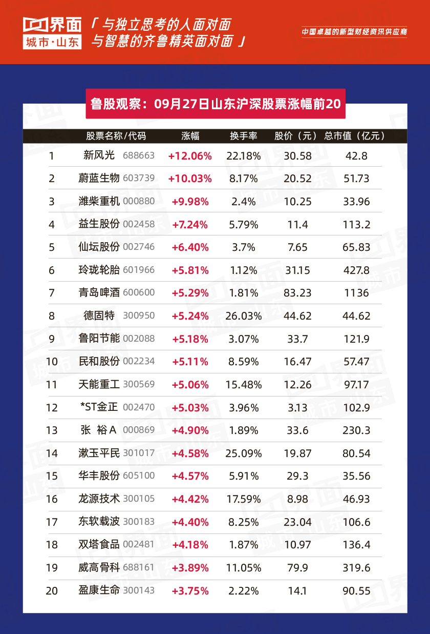 烟台市涨幅榜首:益生股份(002458),涨幅7.24%,股价11.4元,总市值113.2亿元;