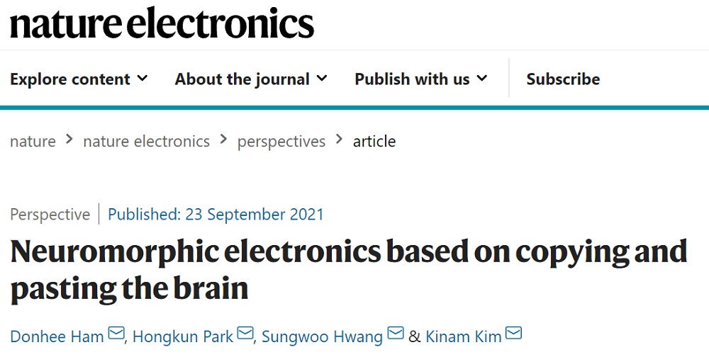 这项研究于9月23日刊登在了顶级期刊《自然·电子》上,论文题目为《Neuromorphic electronics based on copying and pasting the brain(基于复制和粘贴大脑的神经拟态电子学)》。