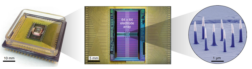 CMOS纳米电极阵列是此前哈佛大学研究团队的成果,该团队在半导体芯片上加工出了4096个记录和刺激电极的CMOS纳米电极阵列,芯片上还有4096个电子通道,可以同时记录数千个神经元的突触连接。2020年,这项研究发表在了《自然·生物医学工程》上。