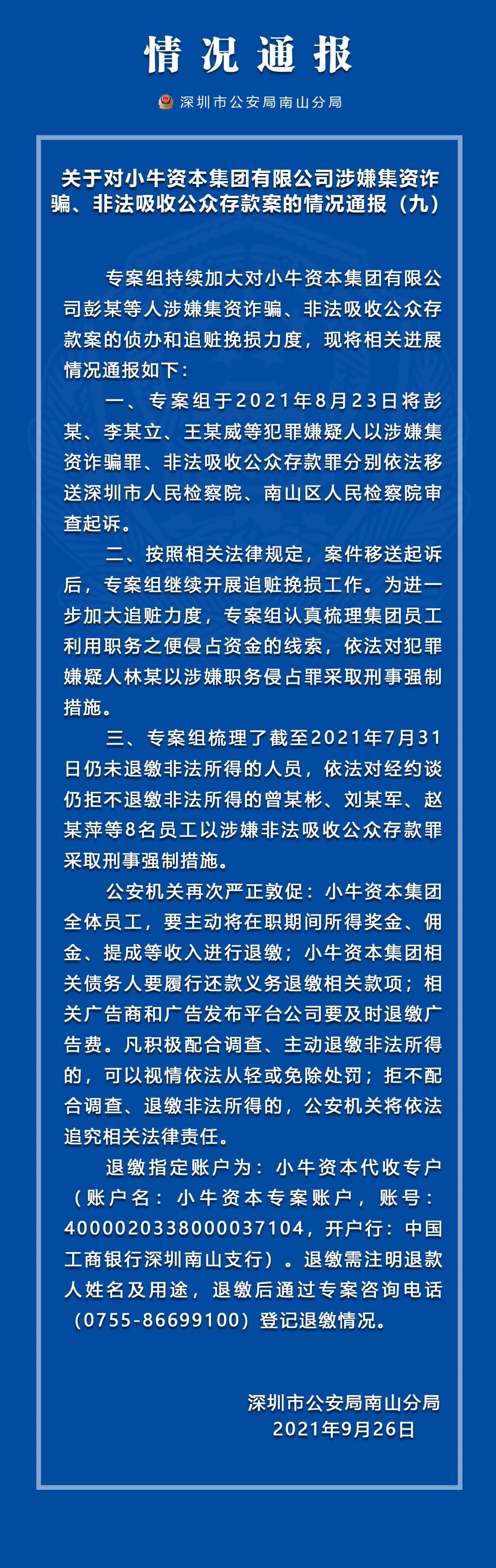 9月26日晚间,深圳市公安局南山分局通过官方微信公众号发布关于对小牛资本集团有限公司涉嫌集资诈骗、非法吸收公众存款案的最新情况通报。该起非吸超千亿案件已移送检察院审查起诉,期间专案组继续开展追赃挽损工作。