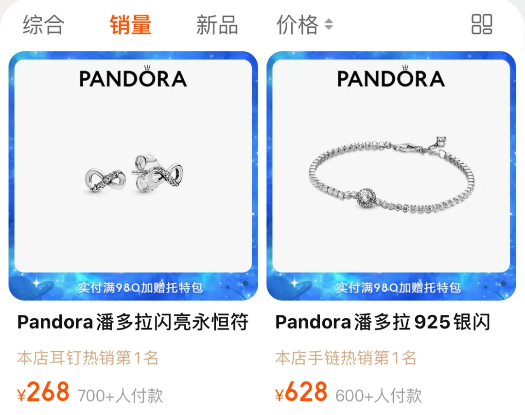打开潘多拉的线上旗舰店,会发现全店销量最高的耳钉,月销量仅有700+,在全店千余款产品中,只有百来款产品的月销量在100+,而大多数款式的月销量不足100,潘多拉“闪耀星河”人气手链月销量也不足100。对于一个曾风靡一时的品牌而言,这个销量无疑是不景气的。