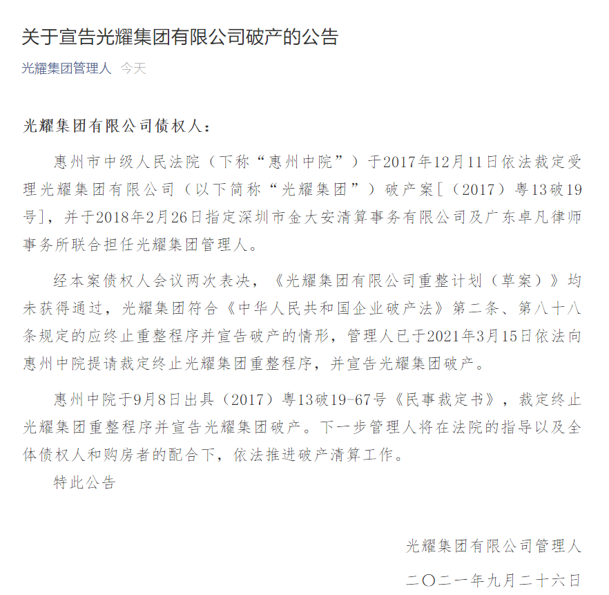 此前,9月8日,惠州中院出具(2017)粤13破19-67号《民事裁定书》,裁定终止光耀集团重整程序并宣告光耀集团破产。