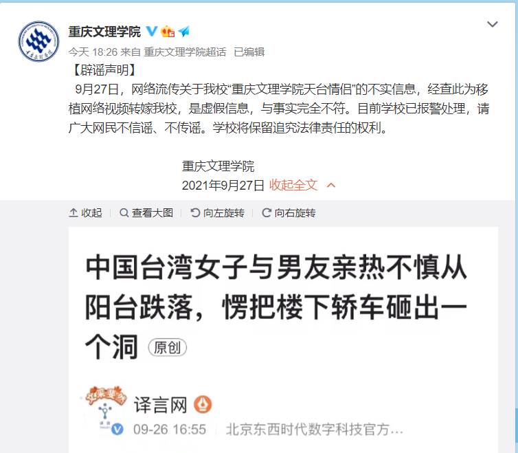 9月27日,@重庆文理学院 发布辟谣声明,9月27日,网络流传关于“重庆文理学院天台情侣”的不实信息,经查此为移植网络视频转嫁重庆文理学院,是虚假信息,与事实完全不符。目前学校已报警处理,请广大网民不信谣、不传谣。学校将保留追究法律责任的权利。