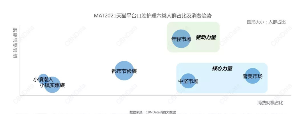 据《白皮书》显示,口腔护理市场的核心消费力量为中坚、奢美,市场消费规模占比分别超30%、40%,消费快速增长超40%的年轻市场则为口腔护理行业的驱动力量,而都市则为节俭族、小镇潮人为小镇实惠族。