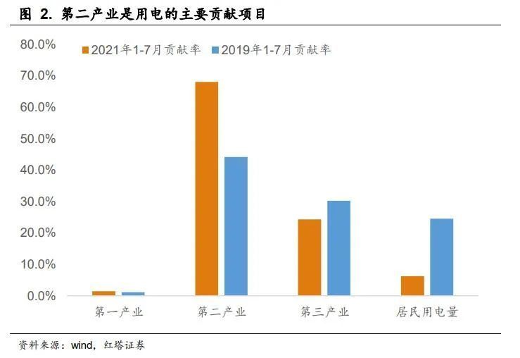 海外需求强、生产弱;国内生产强,需求弱的格局带动中国出口持续走强,1-8月出口同比增长23.2%,两年复合同比增长14%。旺盛的出口推动国内工业生产快速修复,用电量上行。从数据上我们也能够看到今年1-7月第二产业用电量对全社会用电量的贡献率达到了68%,相比于2019年大幅上行。