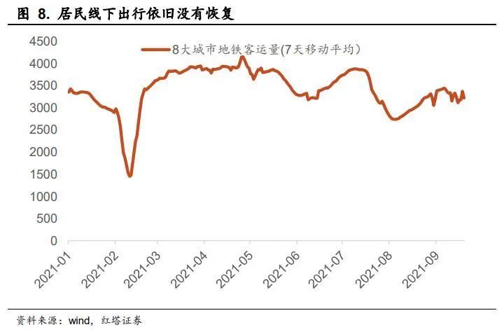 中国的情况则相反,中国率先控制住了疫情,生产快速回升,但是因为疫情小规模反复、居民预防性储蓄回升等,国内消费恢复进度缓慢,1-8月社会消费品零售总额两年平均增长仅3.9%。