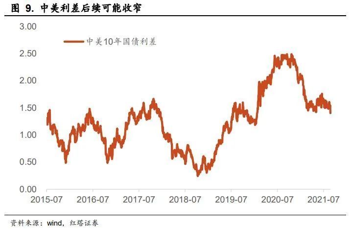 在这样的背景下,我们预计国内货币政策出于支持小微企业等方面的考虑依旧会维持在一个偏松的状态,未来中美利差将逐步收窄。