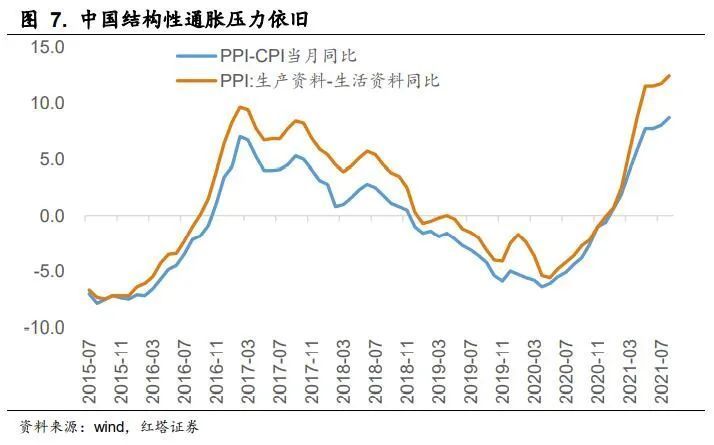 一方面,对于海外而言,中国对生产的压降可能会推动海外通胀的走高。前面我们提到过,在海外央行大放水的情况下,海外需求大幅走高,而生产能力又没有恢复,所以其对中国的生产是比较依赖的。而且因为疫情反复,这一情况一直持续到现在。有着中国生产的支撑,所以此前供需缺口可能并没有那么大。